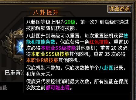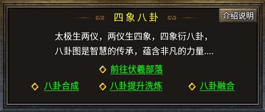 另外还有四象八卦系统,通过合成升级八卦道具提升八卦属性,而合成八卦图所需要的碎片仅能在副本“伏羲部落”中爆取。八卦图还可提升等级,满级20级后可随机解锁一种技能,如对技能不满意还可用重置合成系统获取技能。