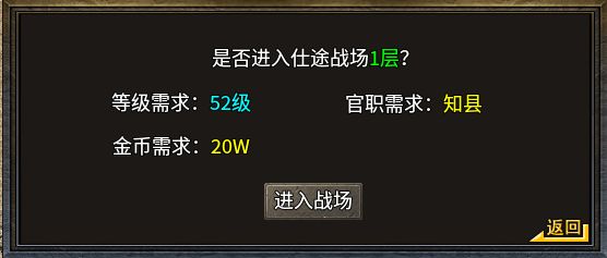 另一个需要再“官运亨通”NPC处提升官职等级,从平民、村正慢慢升到丞相、王侯等,达到指定官职,就能进入仕途战场,去刷取特殊材料和装备。