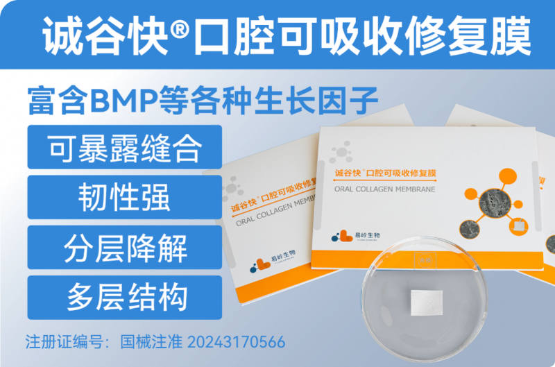 诚谷快®口腔可吸收修复膜(韧性胶原膜),产品四大核心优势:可暴露缝合、韧性强、分层降解(多层结构)、促成骨。作为易岭生物专利技术的结晶(专利号: ZL 2021 10090689.1),产品实现了从原料到成品的直接转化:在保证屏障效果的同时,易岭生物在制作工艺上进行了创新,研发出了直接利用动物源生物膜制备的口腔修复膜及其制备方法,该方法直接对动物源生物膜材料进行一系列处理制备得到口腔修复膜材料,不使用任何交联剂,创新清洗技术,能够大大减少生产操作流程,缩短生产周期,降低了患者的治疗成本,让更多患者可以受惠于科技成果。另外,诚谷快?韧性胶原膜具有独特的多层结构设计,能实现分层降解,具有长达3个月的屏障作用,有效引导骨再生并防止软组织长入,且可完全降解,无需进行二次手术,解决了膜暴露可能引发的感染等并发症这一临床难题。
