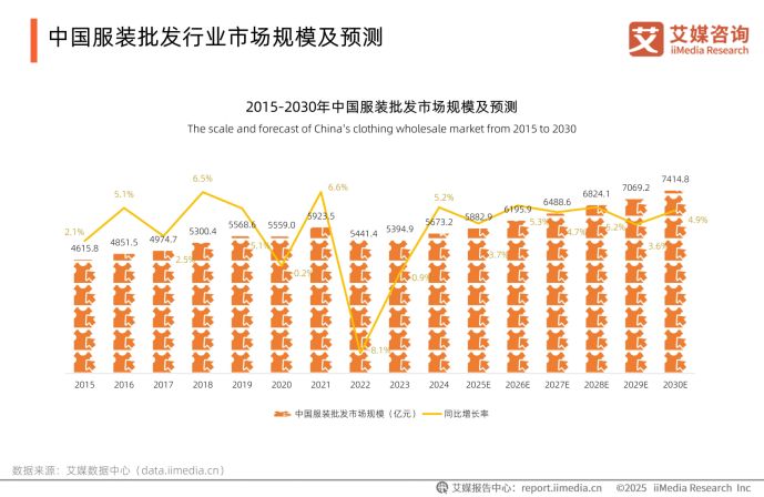 当下,服装行业正迎来细分机遇。消费者需求的日趋多元推动企业深耕垂直赛道,加之国家提振消费专项行动、假期促销与直播电商等新业态激活市场,居民衣着消费需求得以持续释放,带动服装行业规模稳步增长。iiMedia Research(艾媒咨询)数据显示,2024年中国服装批发市场规模已达5673.2亿元,同比增长5.2%,预计到2030年将进一步攀升至7414.8亿元。