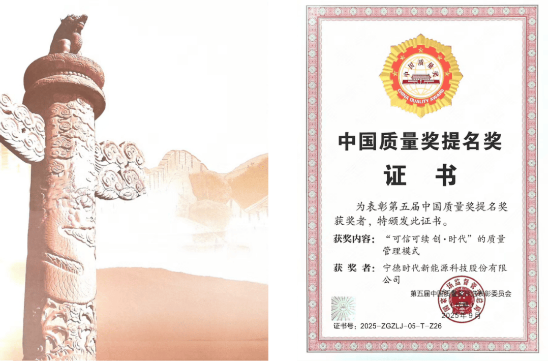 2025年9月16日,在中国质量大会上,国家市场监督管理总局正式颁发第五届中国质量奖,宁德时代凭借"可信可续 创·时代"质量管理模式,荣获中国质量奖提名奖,成为历年以来锂电行业唯一获奖企业。宁德时代质量体系执行总裁李伟出席并领奖。