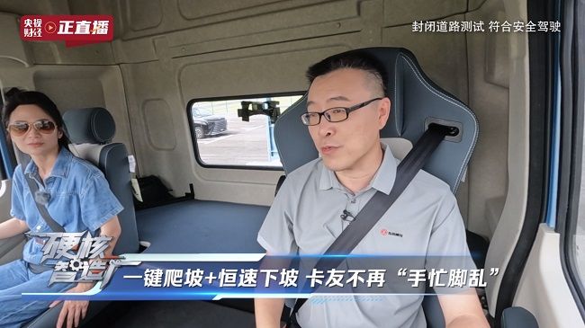 展新副总经理亲自驾驶,带领央视主持人体验了乘龙翼威5的高速行驶、“一键爬坡+恒速下坡”功能以及强化坏路测试等多项性能,让观众直观领略到乘龙翼威5的强劲动力与卓越智能制动控制表现。