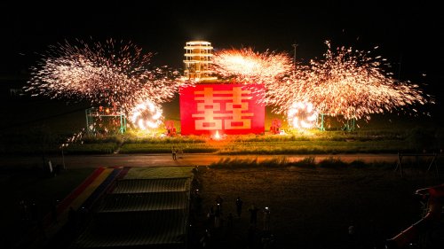 稻田间,非遗打铁花表演绽放火树银花。伴随着激昂的音乐,炽热的铁水在空中四散开来,万千铁花划破夜空,呈现出如烟花般的绚丽景象,为秋夜增添浓厚传统文化氛围,现场观众不时发出阵阵惊叹。
