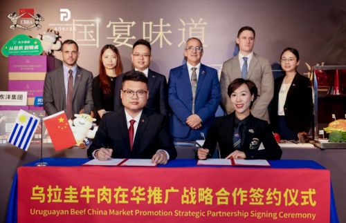 当天,乌拉圭国家肉类协会主席Gastón Scayola、INAC代表Christian Shaw、乌拉圭驻亚洲经理蔡佳欣(Victoria)、乌拉圭驻广州总领事Facundo及代表伍诗悦(Dora)到访东沣食品集团厦门总部。双方就推动乌拉圭牛肉在华推广进行了深度交流,并见证了东沣食品集团与厦门铸型者体育战略合作计划的签署。