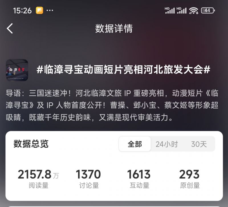 除此之外,《临漳寻宝》在抖音、微博、主流内容平台同样引发广泛讨论。相关微博话题#临漳寻宝动画短片亮相河北旅发大会# 上榜河北全省11个地级市微博同城热搜榜,话题阅读量2157.8万。相关抖音话题#临漳寻宝 获得超2000万曝光量。网友纷纷表示“被萌到了”“想去临漳打卡”。