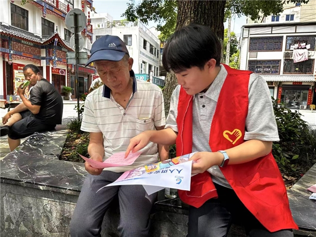 “阿姨您好!我们是黄冈市烟草专卖局的普法志愿者。这本小册子主要介绍防范网络诈骗和保护个人信息的实用知识,另一本涉及老年人健康权益的相关法规。您有空可以看一看,希望对您有帮助。”