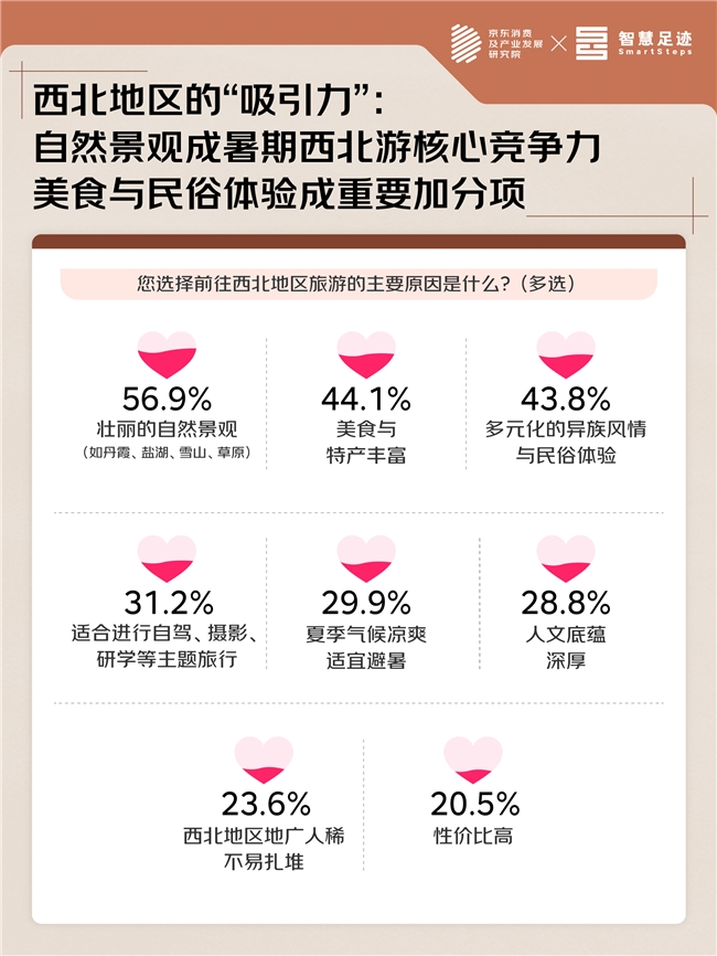 7-8月暑期成为广大游客来到西北地区旅游的黄金窗口期。一方面,西北地区多数省区夏季相对更加凉爽宜人,成为许多游客避暑纳凉的绝佳选择,京东调研显示,近3成游客因“夏季气候凉爽”选择来到西北地区旅游;另一方面,此时的西北地区景色宜人,绝大多数景观均处于最佳观赏期,带动了不同类型主题旅行的盛行,京东调研显示,有近3成的游客看重来到西北地区可以进行“自驾、摄影、研学等主题旅行”。值得一提的是,性价比并非主要决策因素,仅20.5%的游客选择来到西北地区旅游是因为“性价比高”,总体而言,游客来到西北地区更关注体验价值而非花销少。