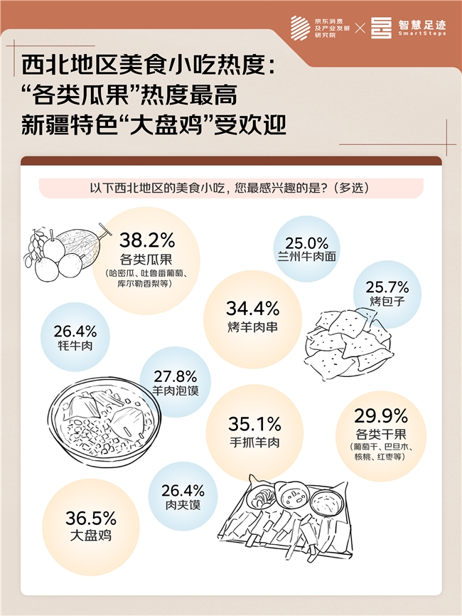 在美食特产方面,西北地区独特的地理位置和气候条件造就了与众不同的饮食文化,“特色美食”也构成对游客的强大吸引力。京东调研显示,提及西北地区,24%的游客首先会想到“能够吃到更加优质牛羊肉”,22.6%的游客青睐“大盘鸡、兰州拉面”等,美食成为重要吸引力,17.7%的游客提及“哈密瓜、葡萄”等瓜果,西北地区物产的独特性被充分认可。暑期正值西北瓜果丰收季,新鲜水果的吸引力显著,游客感兴趣的西北地区美食中,38.2%的游客首选“各类瓜果(哈密瓜、葡萄等)”,游客对“季节性特产”的需求得到满足;作为新疆代表性菜肴,36.5%的受访游客喜爱“大盘鸡”;西北地区的羊肉肉质鲜美,35.1%的游客选择“手抓羊肉”,还有34.4%的游客选择“烤羊肉串”;此外,29.9%的游客选择兼具礼品和自用价值的“各类干果(葡萄干、巴旦木等)”。