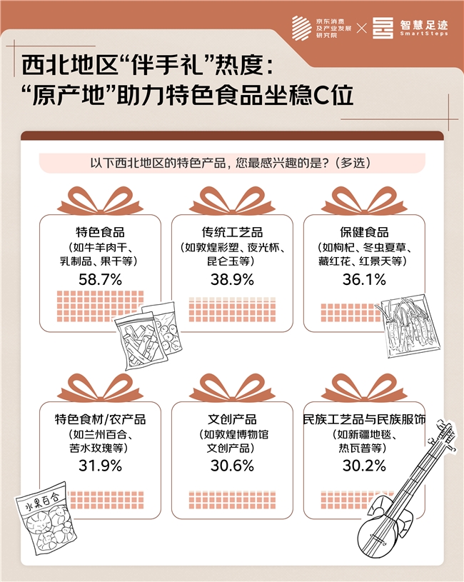 在地方特产方面,旅游人气的聚集有效拉动了西北地区整体消费,体现出“旅行+”的消费联动效应。来到西北地区旅游的游客,往往将在地特色明显的特产作为“必买伴手礼”。京东调研显示,特色食品占据“伴手礼”的绝对优势:58.7%的游客选择“特色食品”(如牛羊肉干、乳制品、果干等),远超其他选项。传统工艺品与保健食品则位于第二梯队:38.9%的游客选择传统工艺品,36.1%的游客选择保健食品,游客对文化符号和健康需求也有相当的关注度。