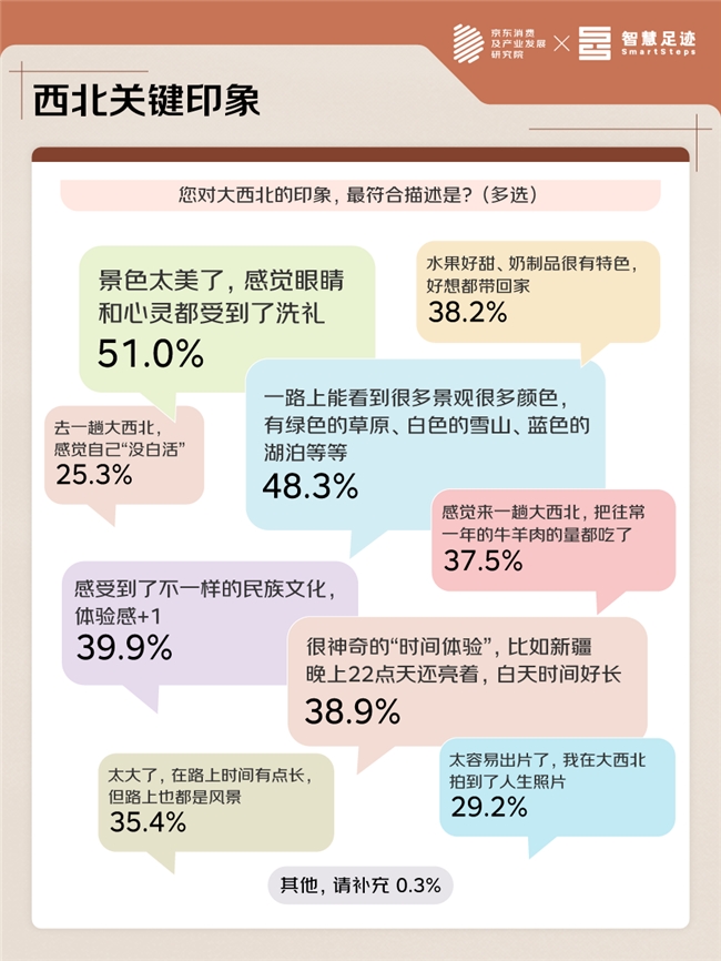 美景、多彩、异域风情体验,这是西北地区给游客留下的三个印象关键词。西北地区多“美景”,其多数景观尤其是自然景观风貌非常不同,让人感受最本真的自然风貌,京东调研显示,51.0%的受访游客感慨“感觉眼睛和心灵都受到了洗礼”,35.4%的游客也表示,“在路上时间有点长,但路上也都是风景”;“多彩”则源于西北地区的多样化的地形地貌带来的视觉享受,近半游客看到了“绿色的草原、白色的雪山、蓝色的湖泊等等”;“异域体验”的呈现多种多样,39.9%的游客“感受到了不一样的民族文化”,38.9%的游客震惊于“很神奇的‘时间体验’,比如新疆晚上22点天还亮着”,38.2%的游客认为“水果好甜、奶制品很有特色”,在地人文、民俗、美食特产,共同构成不一样的大西北。神奇的大西北,将多样的风景、绚烂的画卷、独特的感受带给无数游客,也静静守候着更多人踏上这片神奇的土地。
