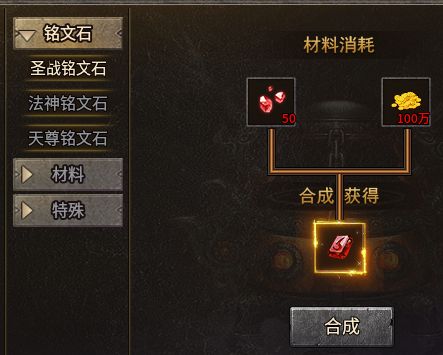 在角色栏可以看到,玩家可以装配三个铭文,第一个铭文槽默认开启,后两个需要消耗金币和对应职业的铭文石才能解锁。职业铭文石可以在精英怪和boss身上获取,也可以直接用铭文石碎片在合成大师NPC处合成。