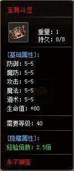 还有像对boss有固伤的吊坠、减免伤害的勋章、增加经验倍数的斗笠,也都是合成大师的业务范围,一旦合成了最终的至尊斗笠,经验获取速度能增加到2.5倍!
