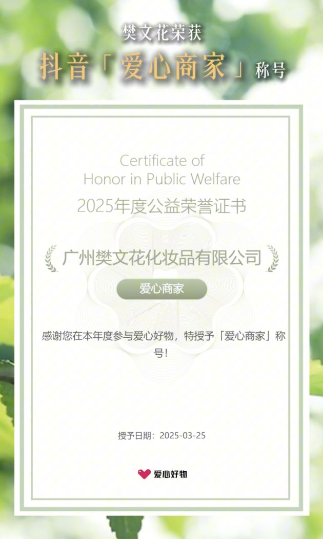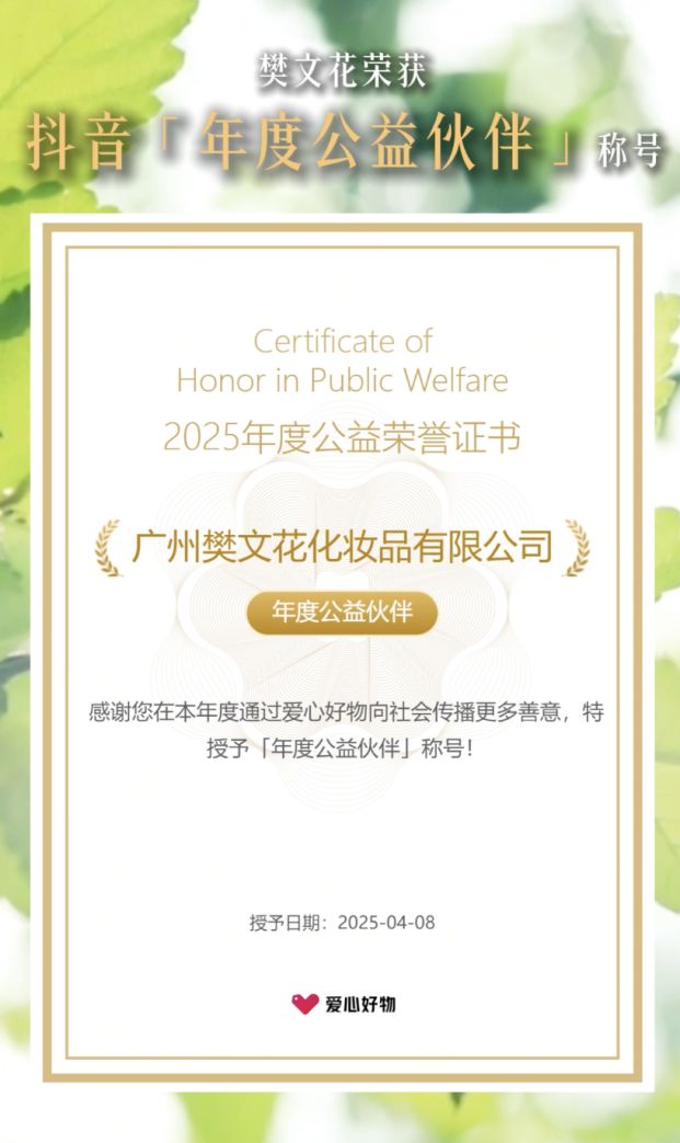此次荣获抖音「年度公益伙伴」及「爱心商家」荣誉称号,是对樊文花过去公益成绩的褒奖,更是对其未来持续贡献的期许。樊文花正用行动证明,一个成功的品牌,必然是富有同情心和责任感的品牌,其“美丽事业”也因这份大爱而更加熠熠生辉。