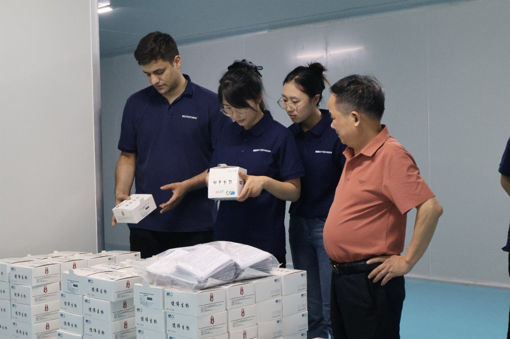 健伟生物科技董事长余建夫(右)为李想(左一)团队成员刘欢(左二)张晓(右二)(右)介绍手术耗材。