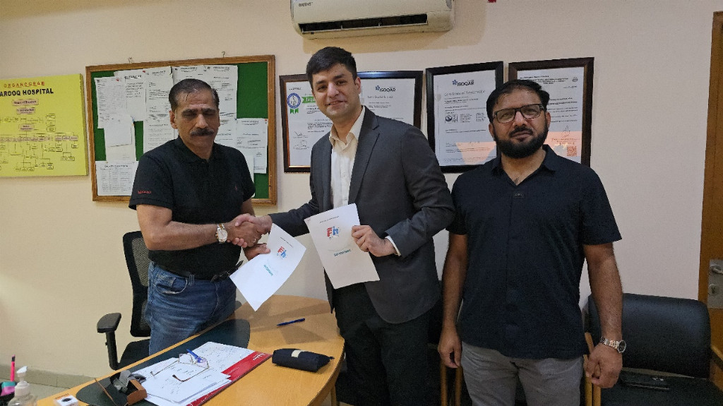 李想(中)与巴基斯坦FAROOQ私立医院院长Dr. Sabir Ayyaz Malik(左)和Dr. Naveed Malik医生(右)签署合作协议。