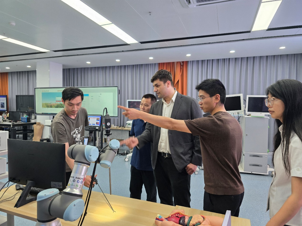 △2025年6月,肖夕林博士(右二)向李想(中)、刘欢(右一)介绍最新研发的腹腔微创手术持镜机器人。
