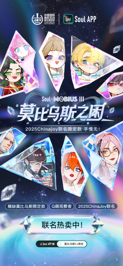在各类数码互动娱乐展会上,特色展台与文创产品往往是吸引关注的重要元素。第二十二届ChinaJoy期间,Soul张璐团队以“Soul树洞情绪疗愈酒吧”为展台主题参展,同步推出原创IP“莫比乌斯·第三弹”ChinaJoy 限定款数字文创,展现平台自主孵化的原生潮流文化,引发广泛关注。