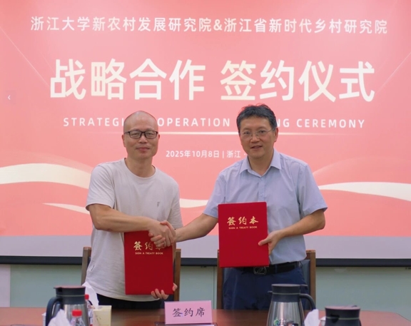 2025年10月8日下午,浙江大学新农村发展研究院与浙江省新时代乡村研究院在紫金港校区举行战略合作签约仪式,正式签署《战略合作框架协议》。双方以服务国家乡村振兴战略和浙江省共同富裕示范区建设为目标,整合高校科研优势与地方政策资源,构建“政产学研用”一体化协同创新体系。此次合作标志着高校深度参与乡村振兴从单一项目向系统性变革的跨越,将为全国校地协同实践树立标杆。