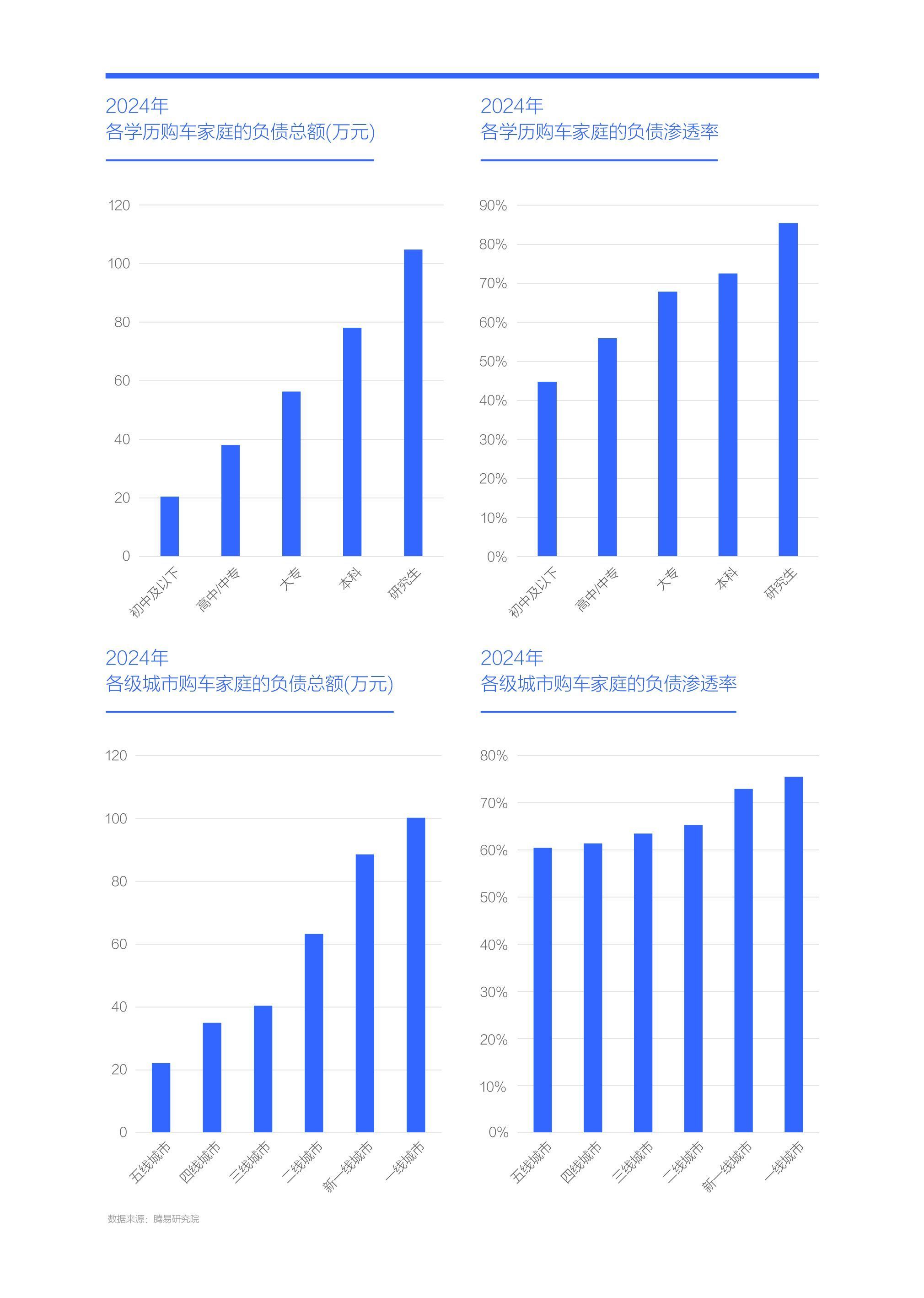中国购车家庭的负债总额与学历有强相关性,学历越高负债越高,2024年本科逼近80万元,研究生一举突破100万元。购车家庭的负债渗透率也与学历有强相关性,整体随学历提升而提升,本科与研究生均突破70%;