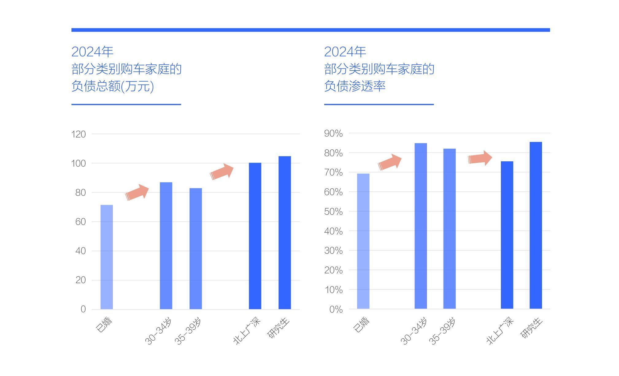 2024年中产主力之已婚购车家庭户均负债突破70万元,渗透率逼近70%,遥遥领先单身用户,“组建家庭”很有压力