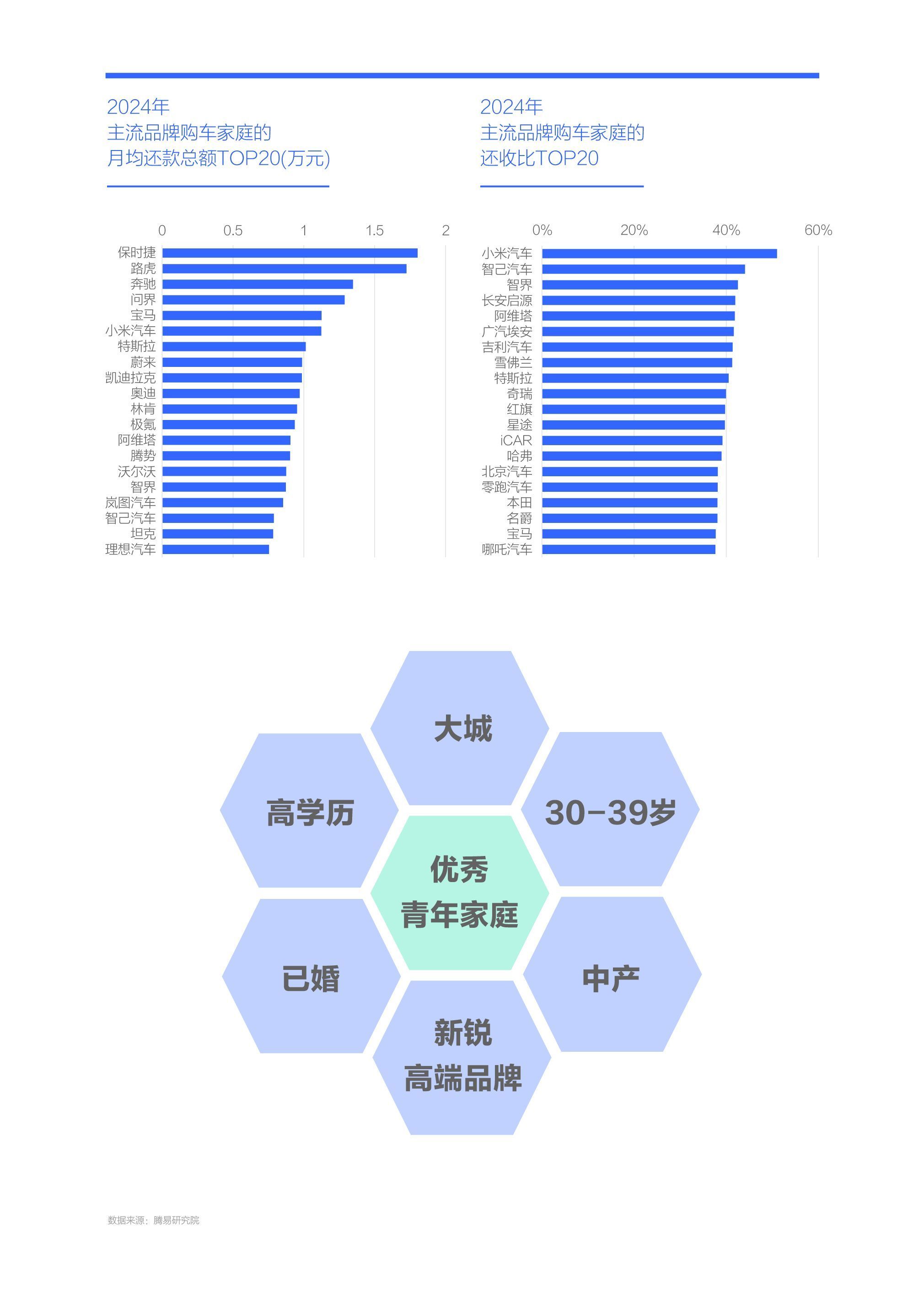 2024年,中国高端品牌购车家庭的月均还款最多,户均超过1万元。目前,在北上广深之一线和杭州、南京、成都、西安等新一线城市,如果房贷和车贷一个都不少,家庭月均还款很容易突破1万元。2024年主流品牌月均还款总额TOP20,几乎清一色为高端品牌,保时捷、路虎与奔驰三大传统高端品牌位居TOP3;
