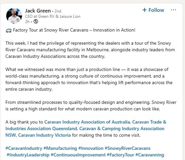 在参观过程中,Snowy River工厂先进的生产线、对品质的严苛把控以及前瞻性的创新设计,赢得了考察团的一致好评。澳大利亚知名房车企业Green RV的负责人在参观后给予高度评价,他表示:“我们所见不仅是一条生产线,更是世界级制造实力的展现。这里融合了持续改进的强健文化,以前瞻性的创新理念,积极推动整个房车行业的发展。从精益生产流程到注重质量的设计与工程实践,Snowy River正在为现代房车制造树立全新标杆。”