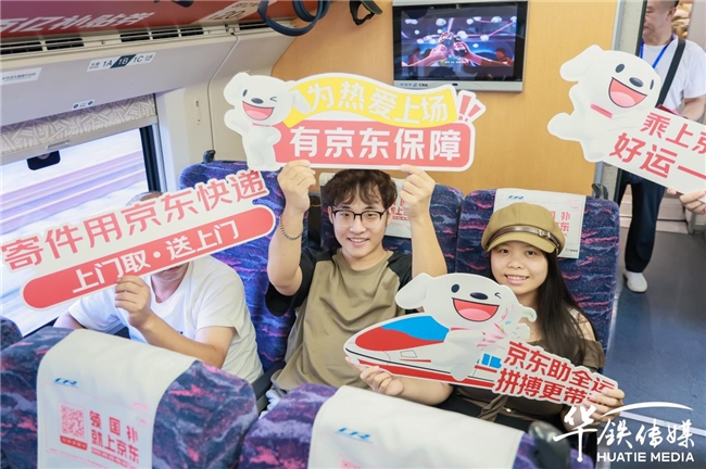 车厢内,头片、桌贴、海报、品牌天幕、语音播报等全媒体形式,构建了专属于京东的品牌移动展厅,全方位展示京东在物流、电商、工业、政企业务等产业领域的全面布局。在此高度聚焦、全程陪伴的传播环境中,叠加深层次的品牌互动活动,消费者不仅深化了对京东业务的认知,更在情感层面建立起对品牌的信赖。京东可靠、高效的服务形象也随之深入人心。