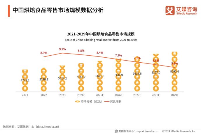 在健康消费升级与烘焙行业结构性变革的双重驱动下,全麦面包赛道近年来呈现出爆发式增长态势。iiMedia Research(艾媒咨询)数据显示,2024年中国烘焙食品零售市场规模已达到6110.7亿元,预计2025年中国烘焙食品零售市场规模达6621.5亿元,同比增长8.4%。伴随人均消费能力的提升与餐饮消费结构的优化,中国烘焙食品零售市场正迎来持续扩容的发展态势,预计到2029年可达8595.6亿元。