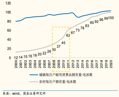 根据国家统计局数据,2020年,我国冰箱的每百户拥有量为101.8台,其中城镇每百户拥有量103.1台,农村每百户拥有量为100.1台。从百户拥有量来看,冰箱在我国已经属于高度普及的家电产品。冰箱行业就此进入存量竞争阶段,增长则依赖于更新换代和结构性升级。