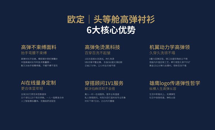 产品功能层面,欧定采用高弹不束缚面料,结合高弹免烫黑科技与机翼动力学高弹领,确保着装的高弹、舒适与有型;在服务体验层面,欧定通过AI定制、AI试衣及1对1穿搭顾问等智能化、个性化服务,为商务精英解决穿衣痛点。弹性既是欧定产品的核心功能属性,也是欧定独特的价值主张,欧定以服装为媒介,将“高弹性”从面料物性升维为当代精英的生活哲学,开创“弹性文化”。这些优势共同构建起欧定在高端衬衫市场的护城河,也为其在智能服装领域的持续拓展奠定基础。