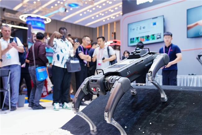 除此之外,MAXHUB X7 工业级四足机器人的智能导航系统、精密多关节驱动结构与自适应步态算法全自研,可搭载机械臂、传感器等装置成为多任务平台,目前已在电力等行业场景实现应用,此前已在2025年世界机器人大会上斩获创新产品大奖。