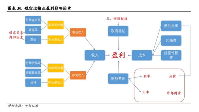 航空运输行业是一个周期性行业,是宏观经济运行晴雨表指标之一。航空运输业的收入来源于客运收入和货邮收入,主要由市场的供给与需求决定,同时受到经济形势、各国政策等方面的影响;航空业的成本分为航油成本和非油成本,主要受到油价波动和汇率波动的影响。
