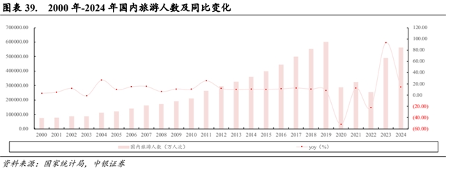 我国旅游市场持续升温,有助于拉动航空出行需求。疫情前国内旅游人次保持 10%左右的增速,体现出当时我国公众对旅行消费需求旺盛。2020-2022 年受新冠疫情影响国内旅游人数大幅下降,2023-2024 年新冠疫情影响减弱,旅游市场热度回升。2024 年,国内旅游人次达 56.2 亿人次,同比增长 14.80%,基本恢复至 2019 年水平。中期来看,国际航线复航仍需时间,出境旅行回流给航空市场带来增量客源,中国航空业长期供需向好。