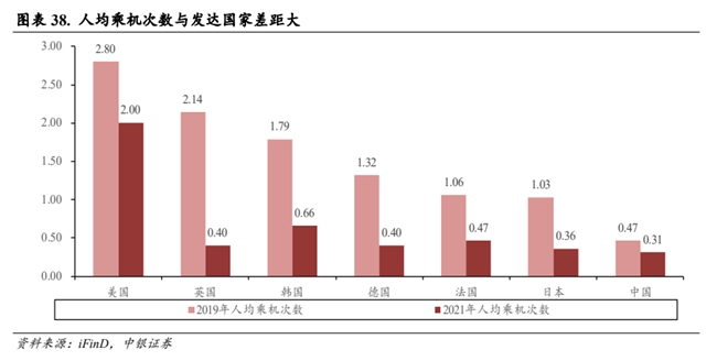 从长期来看,随着我国年人均GDP的增长,居民消费能力提升,航空渗透率有望逐年上升。根据历史数据和相关研究,年人均乘机次数与年人均GDP呈现正相关性,当乘机次数较低时,GDP增长对乘机次数的提升作用更为明显。我国人均乘机次数仍有较大提升空间,航空客运量有望增长。2019 年国内人均乘机次数是 0.47 次,和欧美发达国家和日韩人均乘机次数相比较低,仍有较大提升空间。长期来看,随着经济的不断发展以及航空基础设施的不断完善,我们认为未来我国人均乘机次数有望继续提高,航空需求仍有较大增长空间。