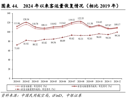 目前从结构构成看,国内航空客运需求基本恢复,国际客运需求恢复仍需时间。2024 年 12 月,旅客运输量达 5697.7 万人次,恢复到 2019 年同期的 107.99%,其中国内航线旅客运输量达 5069.5 万人次,恢复到 2019 年同期的 109.17%,国际航线旅客运输量达 628.2 万人次,恢复到 2019 年同期的99.34%。2024 年 1-12 月累计旅客运输量 7.3 亿人次、恢复到 2019 年同期的 110.66%。其中,国内航线旅客运输量累计 66464.4 万人,恢复到 2019 年同期的 113.49%,国际航线旅客运输量达 6555.4万人次,恢复到 2019 年同期的 88.33%。