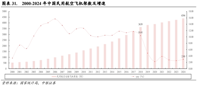 中国民用飞机机队规模稳步增加,但疫情后机队增速呈现“下台阶式”趋势。据国家统计局数据显示,疫情前 10 年(2010-2019 年)中国民用飞机架数增速均值为 10.44%,机队规模从 2010 年 1597架次上升至 2019 年 3818 架次。2020-2024 年中国民用飞机架数增速均值降至 2.85%,机队规模从 2020年 3903 架次增至 2024 年 4394 架次。