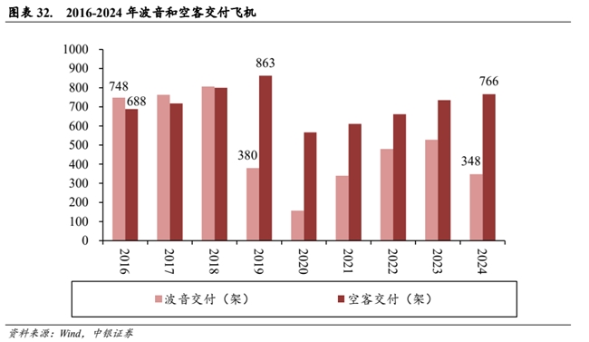 受全球供应链扰动等因素影响,主要飞机制造商订单交付能力下降。据波音和空客披露数据显示,2016-2019 年,波音、空客年均交付飞机 674 和 767 架次,2020 年新冠疫情发生后,飞机交付能力明显下降,2020-2024 年,波音、空客年均交付飞机 371 和 668 架次,相比 2016-2019 年的均值分别下降 45.0%和 13.0%。