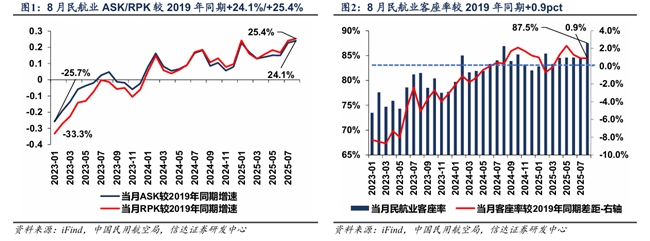 根据民航局公布的2025年8月行业最新数据,行业整体运力及周转量同比增速环比上月略降,月度客座率同比、对比19年同期小幅提升。 对比2019年情况:2025年8月当月行业ASK、RPK较2019年同期+24.1%、+25.4%,相应客座率达到87.5%,较2019年同期+0.9pct。 同比2024年情况:2025年8月当月行业ASK、RPK同比分别+5.1%、+5.8%,客座率同比+0.6pct。行业运力及周转量同比增速继续放缓,客座率高基数背景下仍有小幅增加。