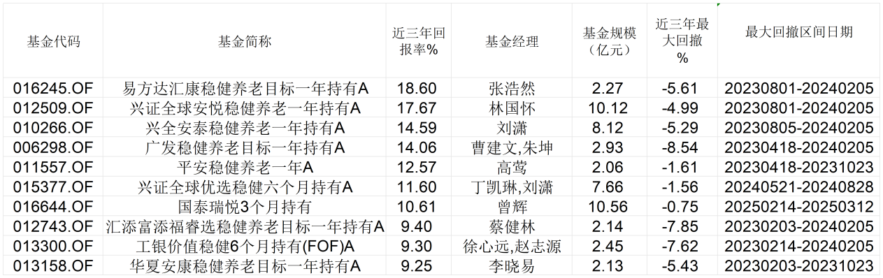 表:截至三季度末,近三年来回报率靠前、回撤率较小的10只FOF明细