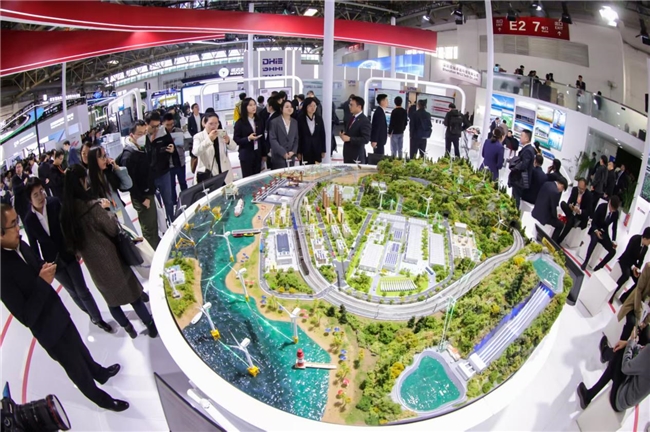 在中国中车展区中央,一座集海陆场景于一体的大型沙盘成为焦点,生动呈现了风、光、水、储、氢等多领域融合创新的成果。
