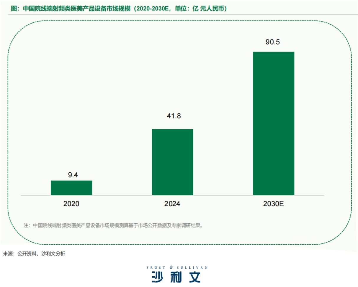 当前非手术类医美已成为中国医美市场的主流,2024年市场份额达65%;其中射频类项目因恢复期短等优势,成为能量源类医美中增长最快的细分赛道。从市场规模看,中国院线端射频设备市场呈现“爆发式增长”,预计2030年将突破90.5亿元。