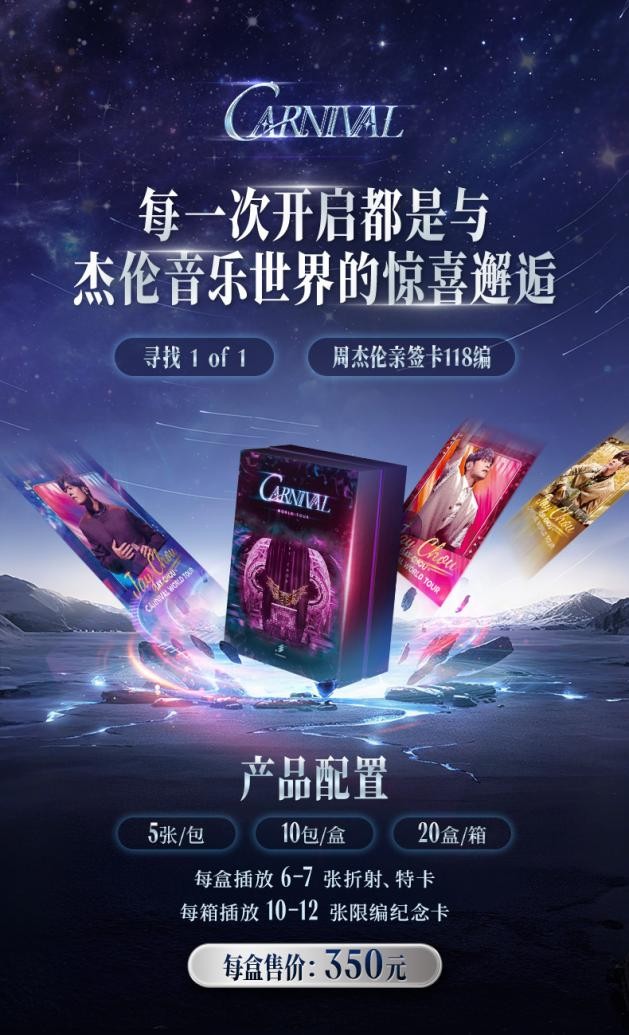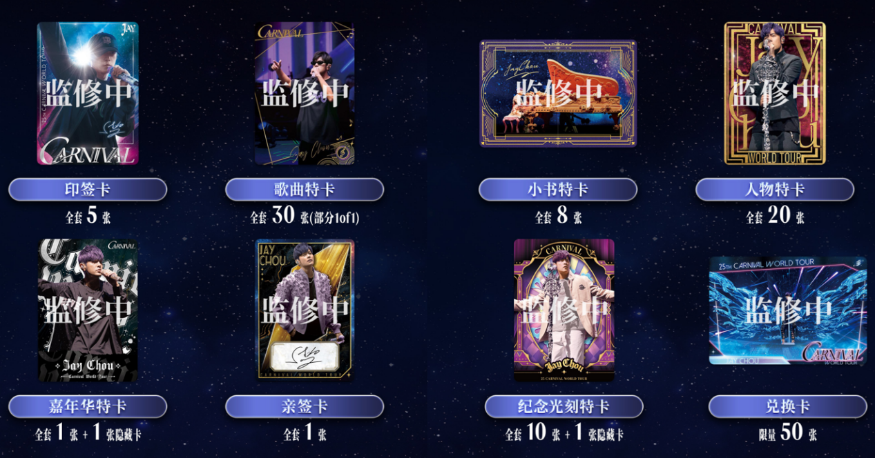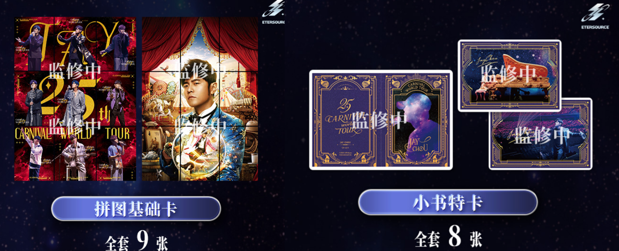 特色形制卡牌更添拆卡趣味与收藏价值:拼图基础卡:全套9张,更是将嘉年华演唱会主题与出道 25 周年纪念元素融合,为周杰伦25年来的乐坛卓越影响力留念;小书特卡:全套8张,采用折页开合设计,翻开即呈现经典片段,宛如“口袋里的演唱会纪念册”;