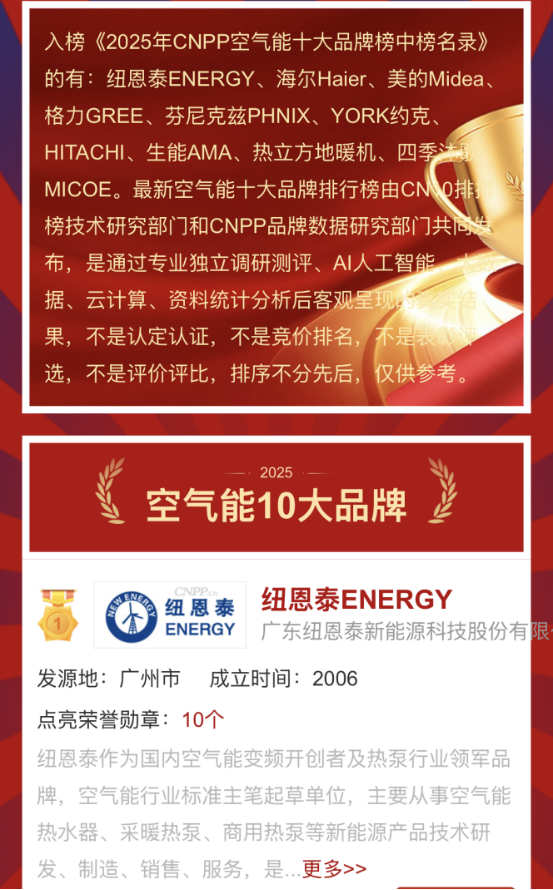 空气能采暖品牌怎么选?究竟哪款产品更符合家庭需求?近日,十大品牌网(CNPP)通过专业独立调研测评、AI人工智能、大数据等综合分析后,发布了《2025年CNPP空气能十大品牌榜中榜名录》,上榜的有纽恩泰、海尔、美的、格力等品牌,为消费者的双11选购提供了参考。本文将深度分析榜单中十大品牌的核心优势,并推荐合适的产品,为您的冬季采暖提供清晰的解决方案。