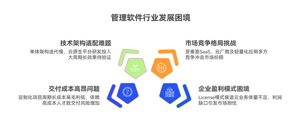 头部厂商的“慢性病”表现为高营收增长与低净利润率长期并存、云业务增速难以弥补传统license收入下滑、研发费用率持续高企,吞噬利润空间。而个别企业的“急性发作”为大项目拖累导致资金链断裂、高度依赖的定制化项目模式失去可持续性、人力成本高企与回款缓慢的双重挤压。