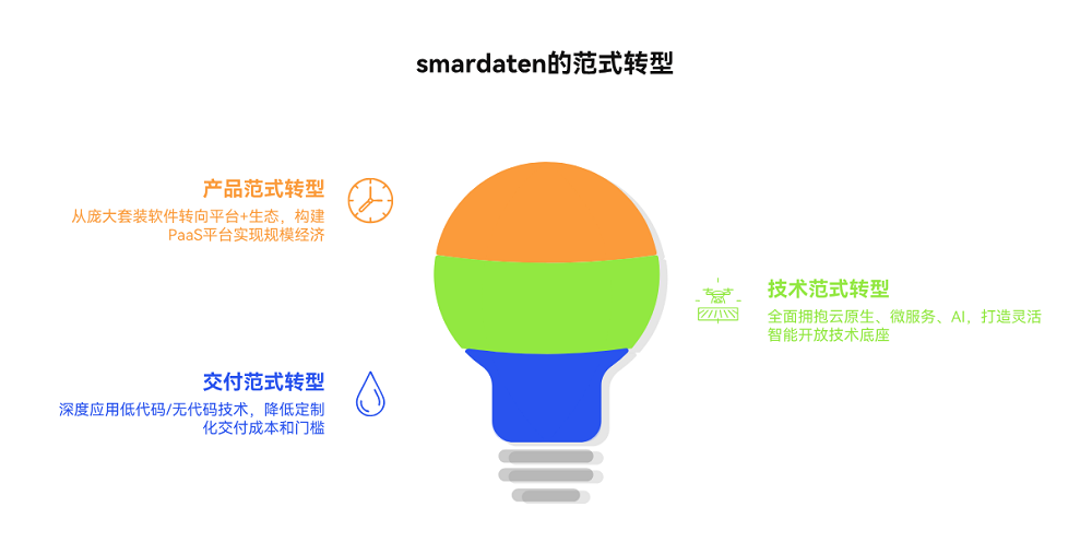 1.产品范式转型:从“庞大套装软件”转向“平台+生态”,构建强大的PaaS平台,让自身和合作伙伴都能基于平台快速开发、交付应用,从而满足个性化需求的同时,实现规模经济;