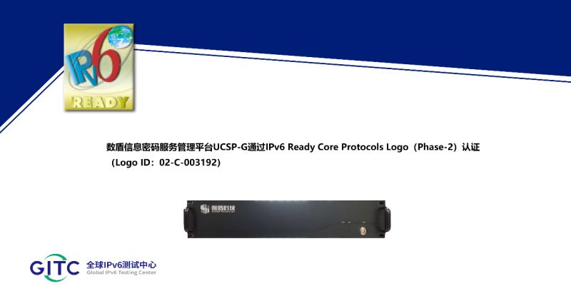 近日,数盾信息科技股份有限公司旗下加密全网关TSG、TSG-、密码服务管理平台UCSP-G在下一代互联网国家工程中心-全球IPv6测试中心正式通过IPv6 Ready核心协议Phase-2测试,并荣获由国际组织IPv6 Forum颁发的IPv6 Ready Logo Phase-2认证证书。这标志着上述产品的IPv6核心协议实现已全面符合IETF RFC相关标准,其一致性和互通性得到了权威验证。