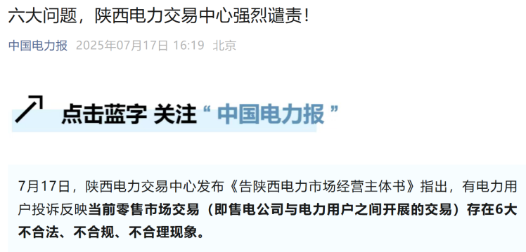陕西电力交易中心发布《告陕西电力市场经营主体书》指出,有电力用户投诉反映当前零售市场交易存在6大不合法、不合规、不合理现象。其中,部分售电公司利用信息差,向用户传递错误的市场政策和行情信息,伪造假公章、假合同的方式签约用户,在用户不知情的情况下开展电力交易。