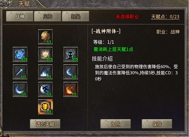 本服的天赋系统并非随机赋予某个孤立的小技能,而是设计了一套完整的天赋树。三职业各有3套天赋树可以发展,不同的天赋有不同的专精方向,战士有战神、风神、狂暴,道士有兽王、毒王、符神,法师有唤王、雷公、火神。形成9个方向的职业发展,供玩家自由选择,天赋在48级之前可以不限次数的免费切换,做足了三职业的细化与丰富,变单纯为细腻。