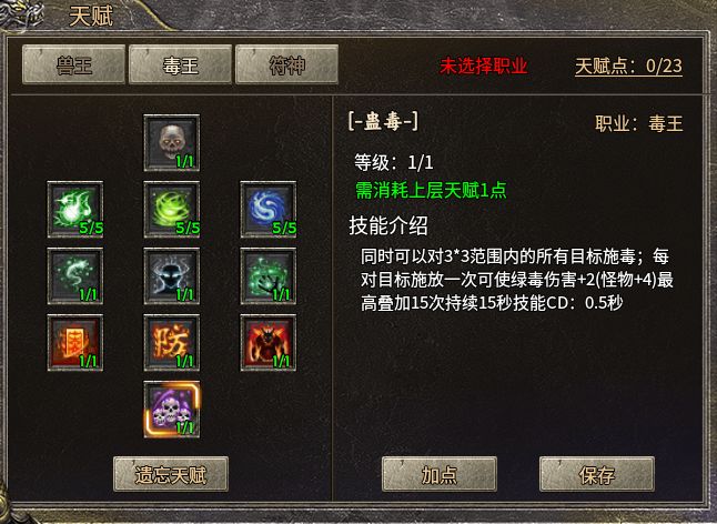 二号天赋树“效率专精”,专注于提升刷怪与发育效率,让你在挑战副本和清理怪物时得心应手,其中道士只有在选择这一天赋树时,才可使用特殊道具制作强力的红绿上古邪毒,能轻易瓦解敌人防御,刷怪效率全面拉满。