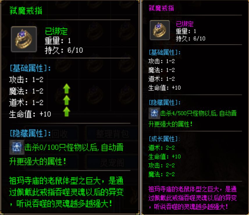 前期还能很容易地获得大量的弑魔戒指,由于其初始的基础属性较为平庸,很容易被玩家忽视。其实它也同样拥有进化能力,从普通到高阶相当战力不凡。而本服对散人及新手的诚意即写在这些点滴细节中,还是那句话“只要去积累保你有收获”。
